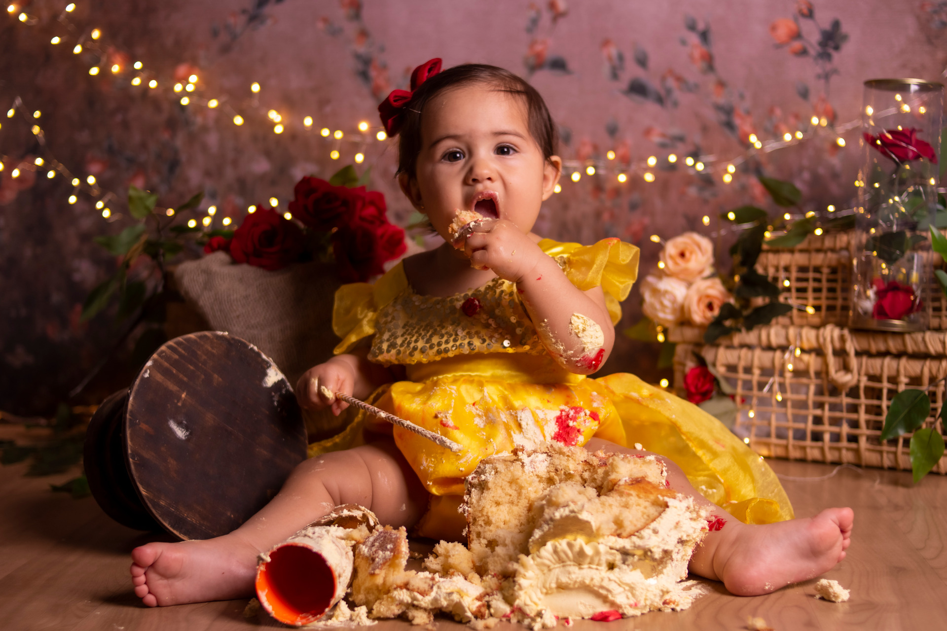 A probabilidade do bebê não gostar do bolo é de 50%, para isso temos uma estrutura de ensaio que garante fotos do bebê limpo e feliz.