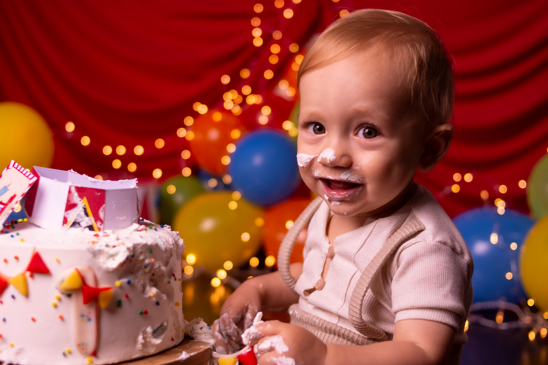 O smash the cake é um ensaio exclusivamente sensorial até os 13 meses. Idade pela qual os bebês ainda tem suas características e ações do primeiro aninho de vida. Eles costumam demonstrar curiosidade e explorar o desconhecido.