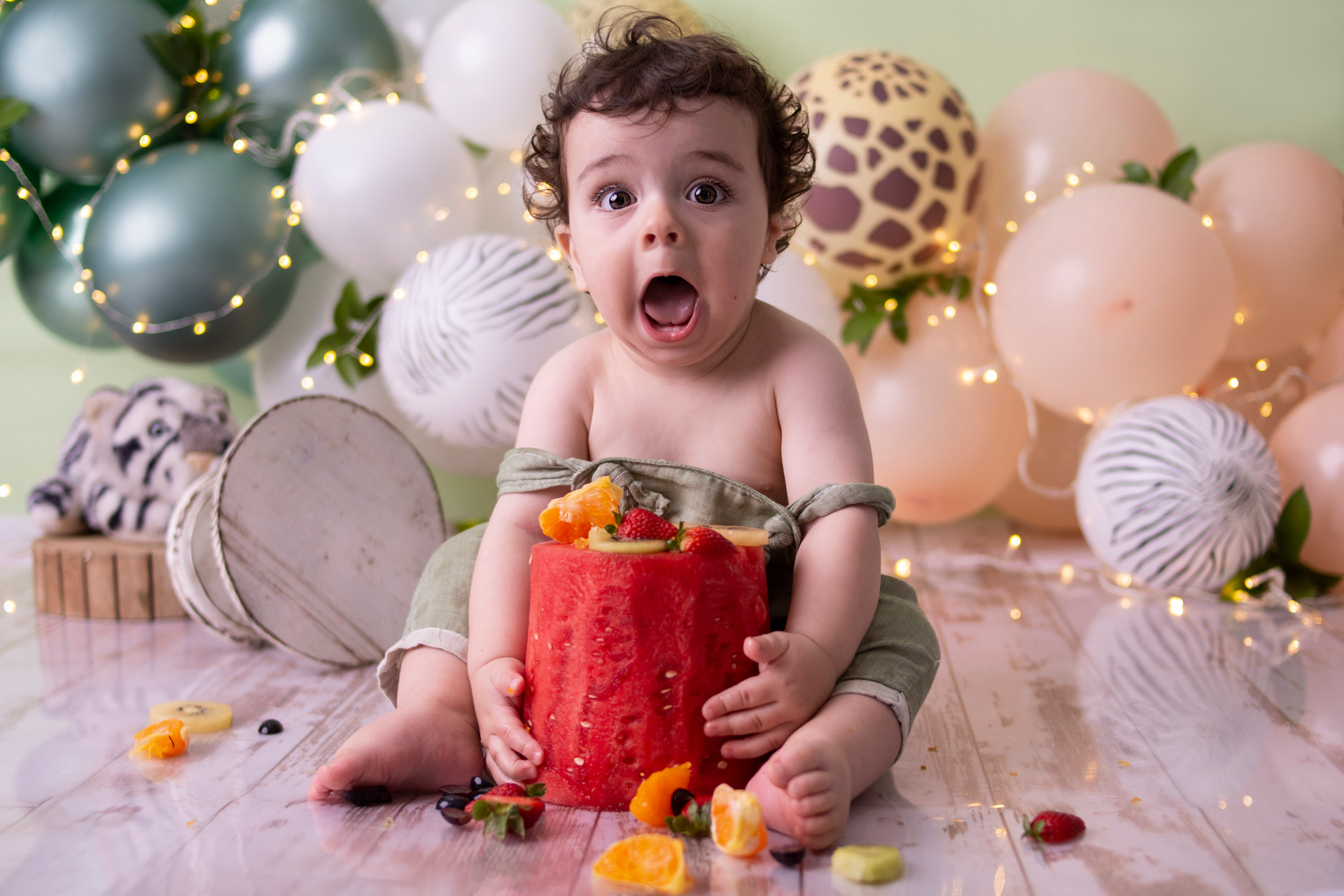 O bolo de frutas é uma aposta boa para quem não quer arriscar o bebê chegar perto do bolo convencional, mas se ainda assim você quiser a grande meleca, não se preocupe, não permitiremos que sua criança coma o bolo.
